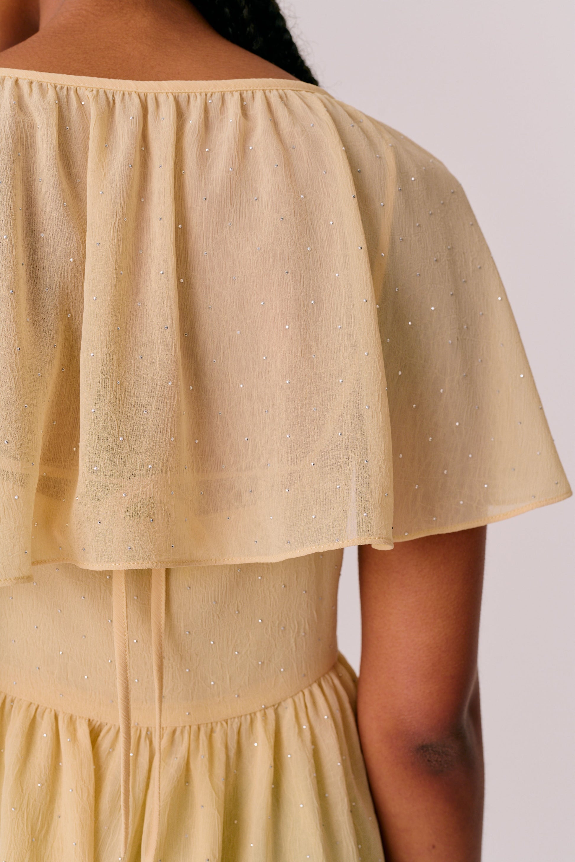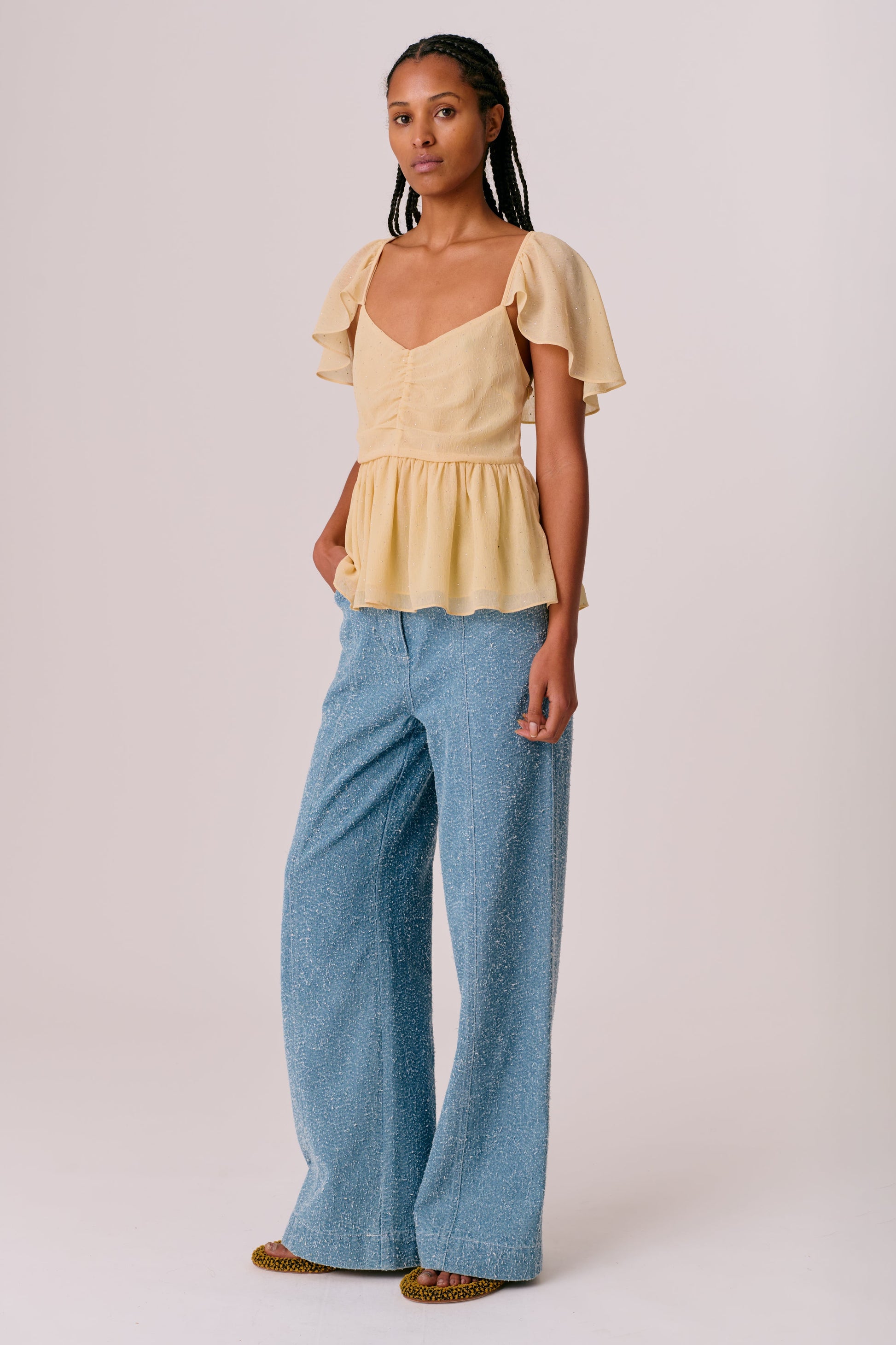 This feminine top is cut from light, shimmering chiffon in a soft butter cream shade. It features fluttering draped sleeves, a softly ruched chest with smock detail, and a gently ruffled peplum hem that adds movement and shape.