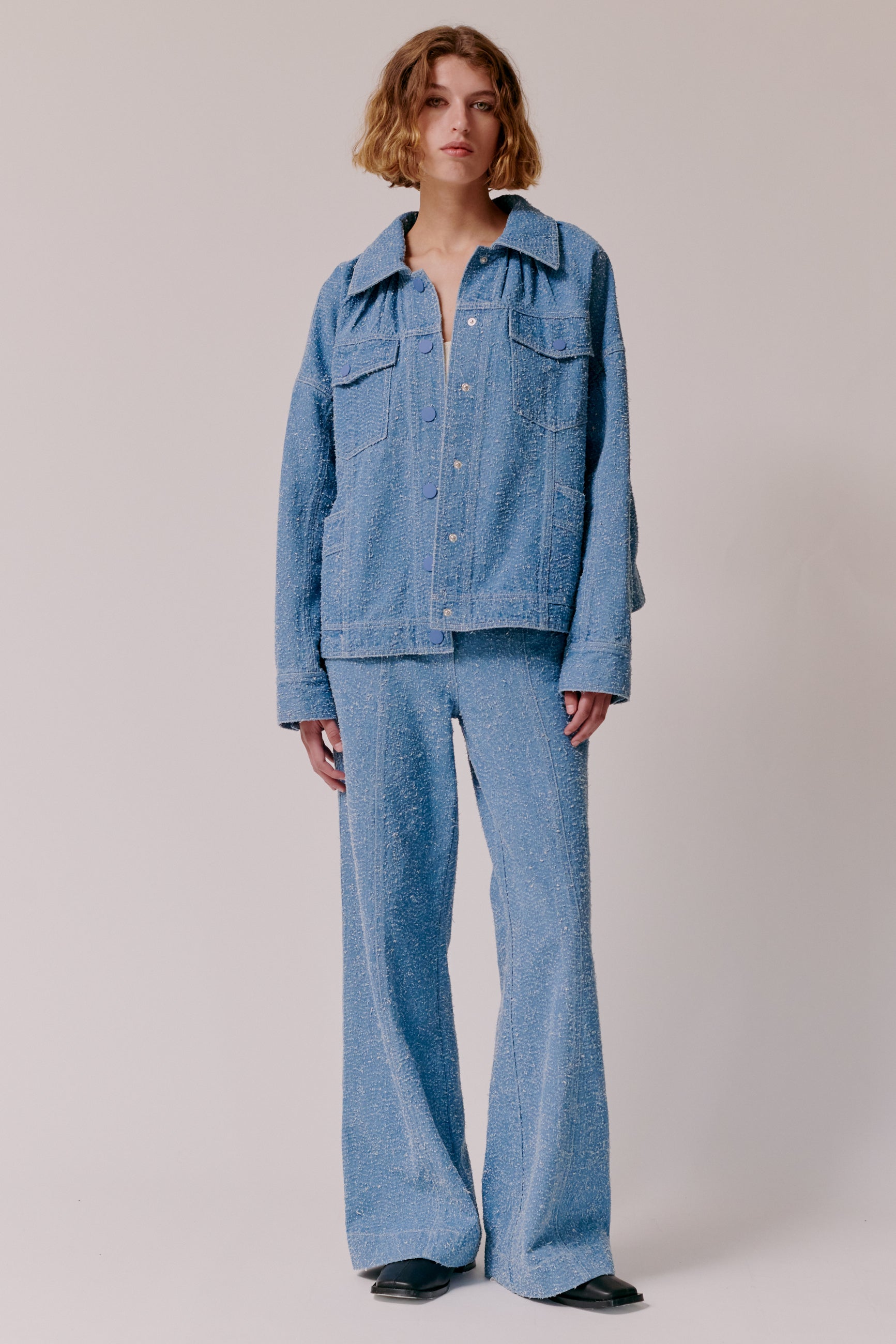 Crafted from a heavy denim fabric, the trousers are defined by bold contrast stitching, giving the look a graphic, unfinished quality — effortlessly cool and easy to style across seasons.
