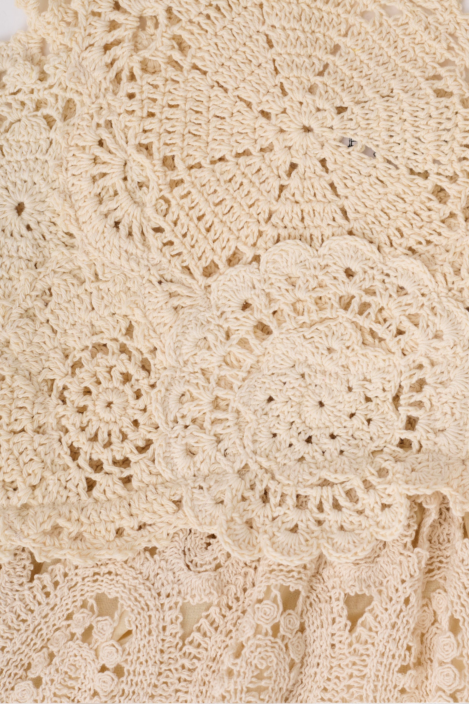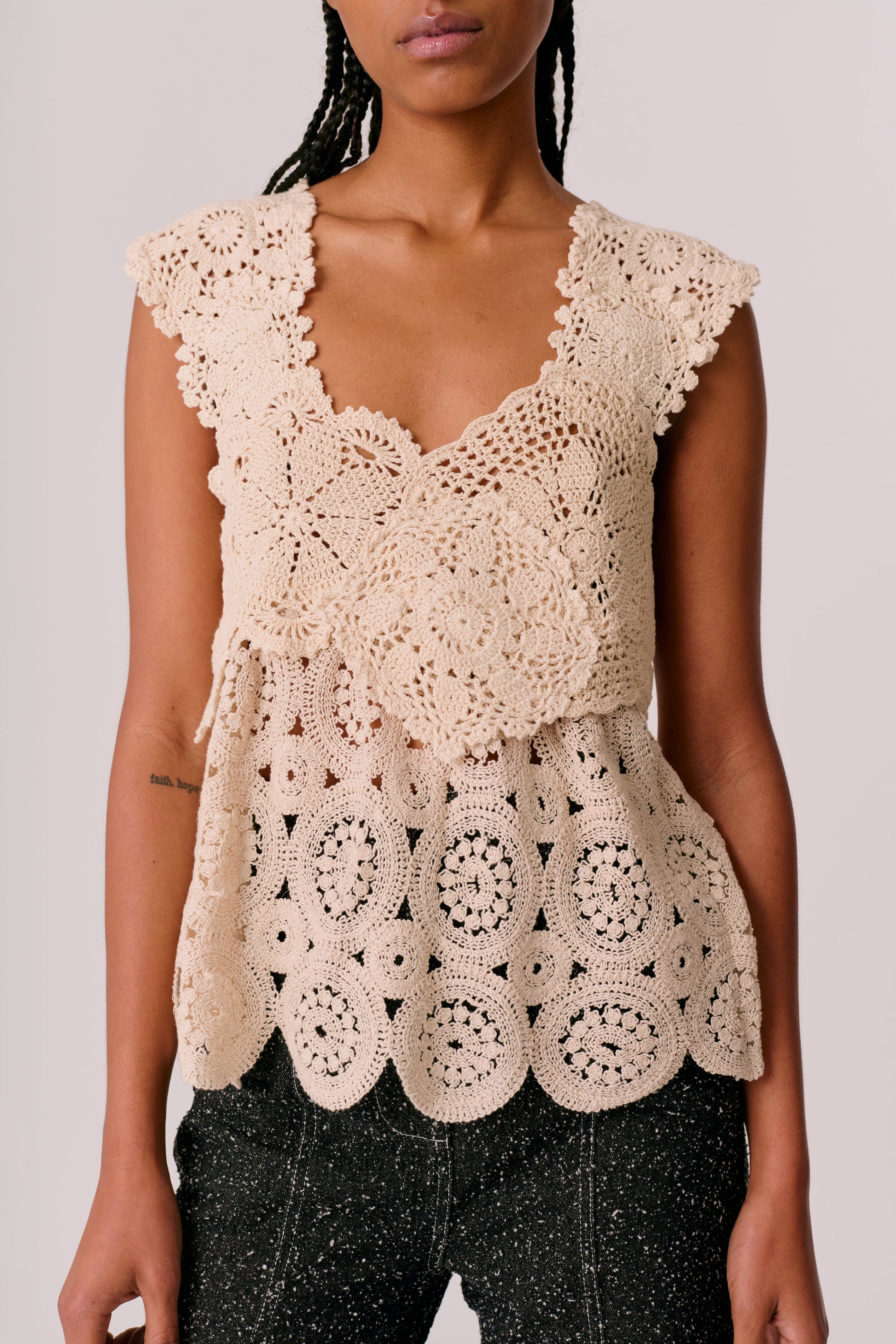 This sleeveless top is crafted from 100% cotton in a warm sand tone and features intricate, circular crochet motifs throughout. The soft V-neckline and scalloped hem add a feminine touch, while the openwork structure keeps the silhouette light and breathable.