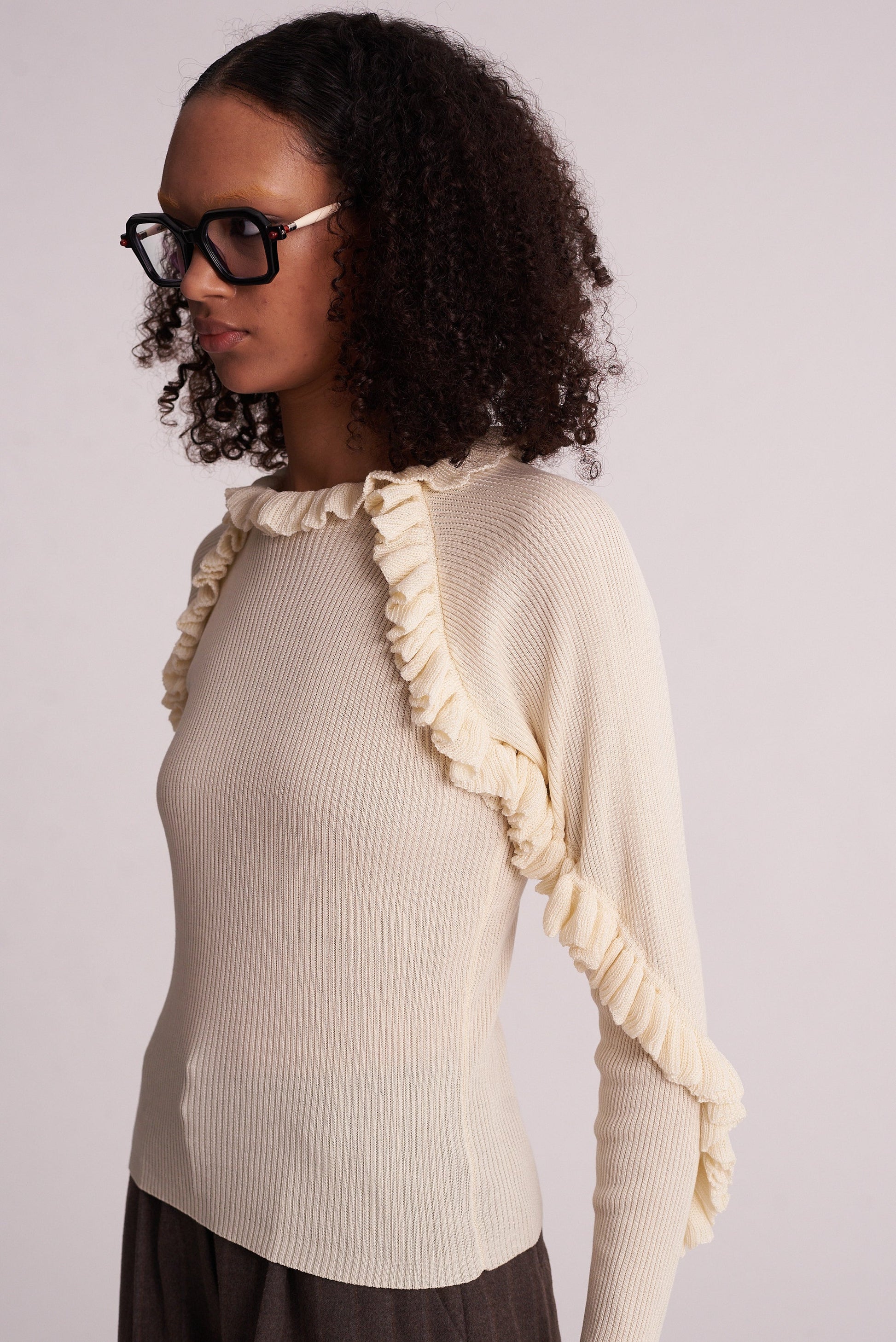 Rib knitted blouse with frills at neck and over the raglan styled sleeves.