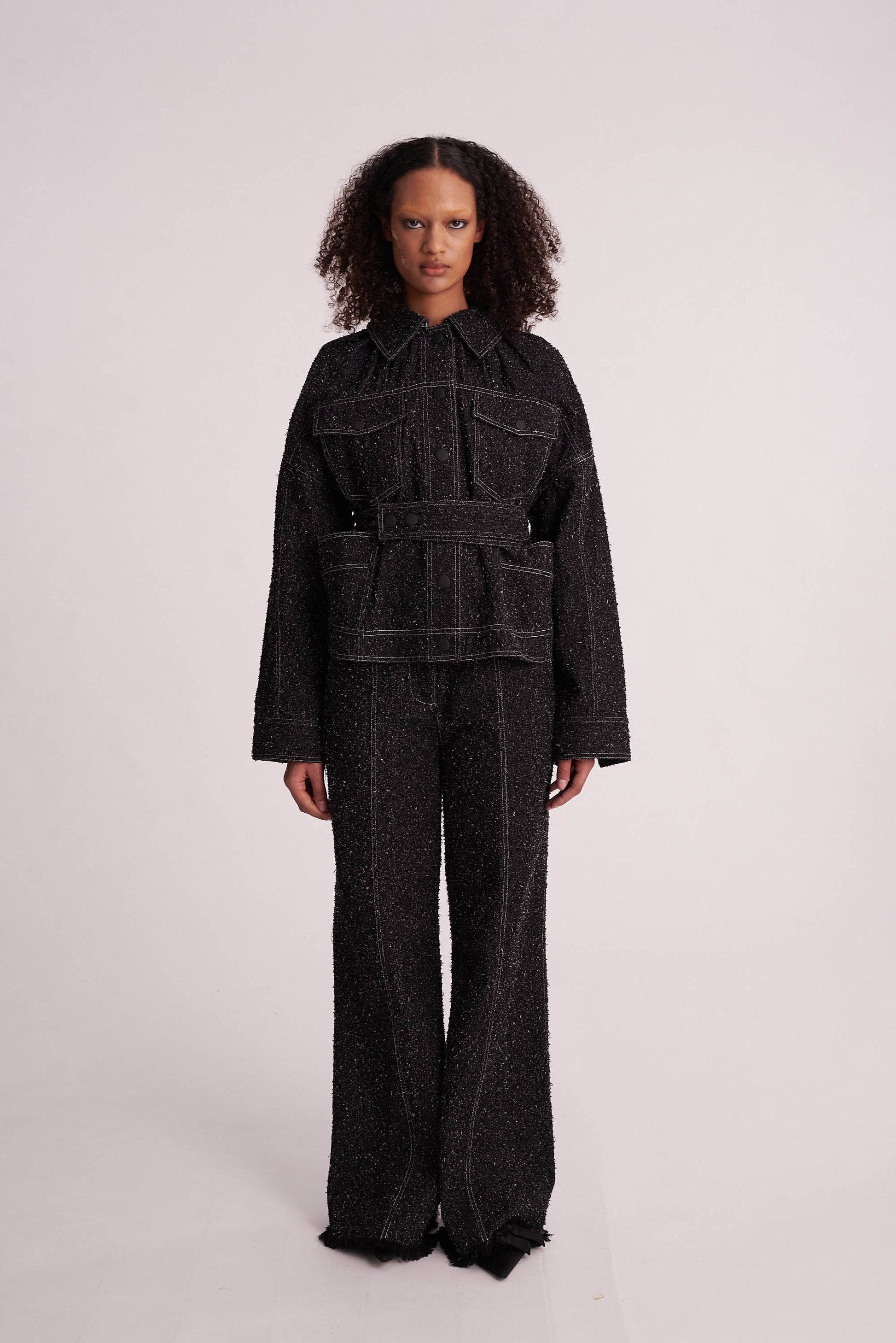 Denim jacket with dropped shoulders, push buttons and adjustable belt.
